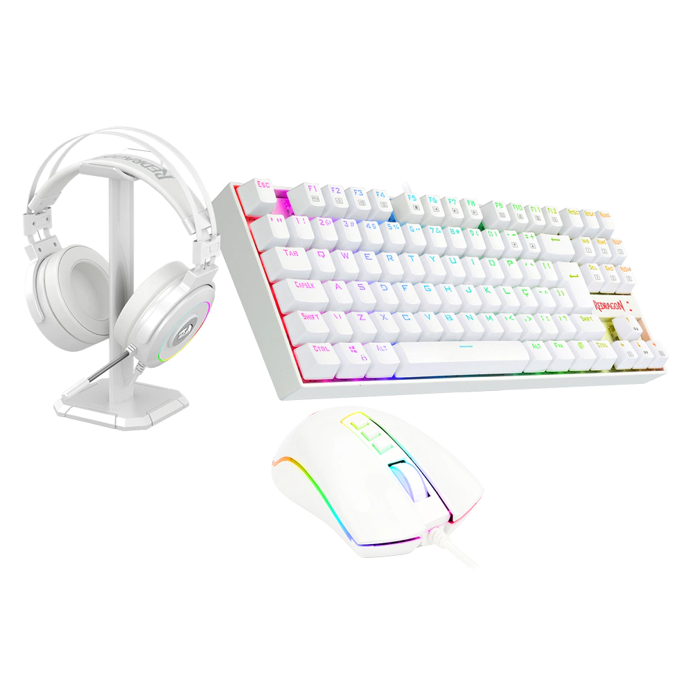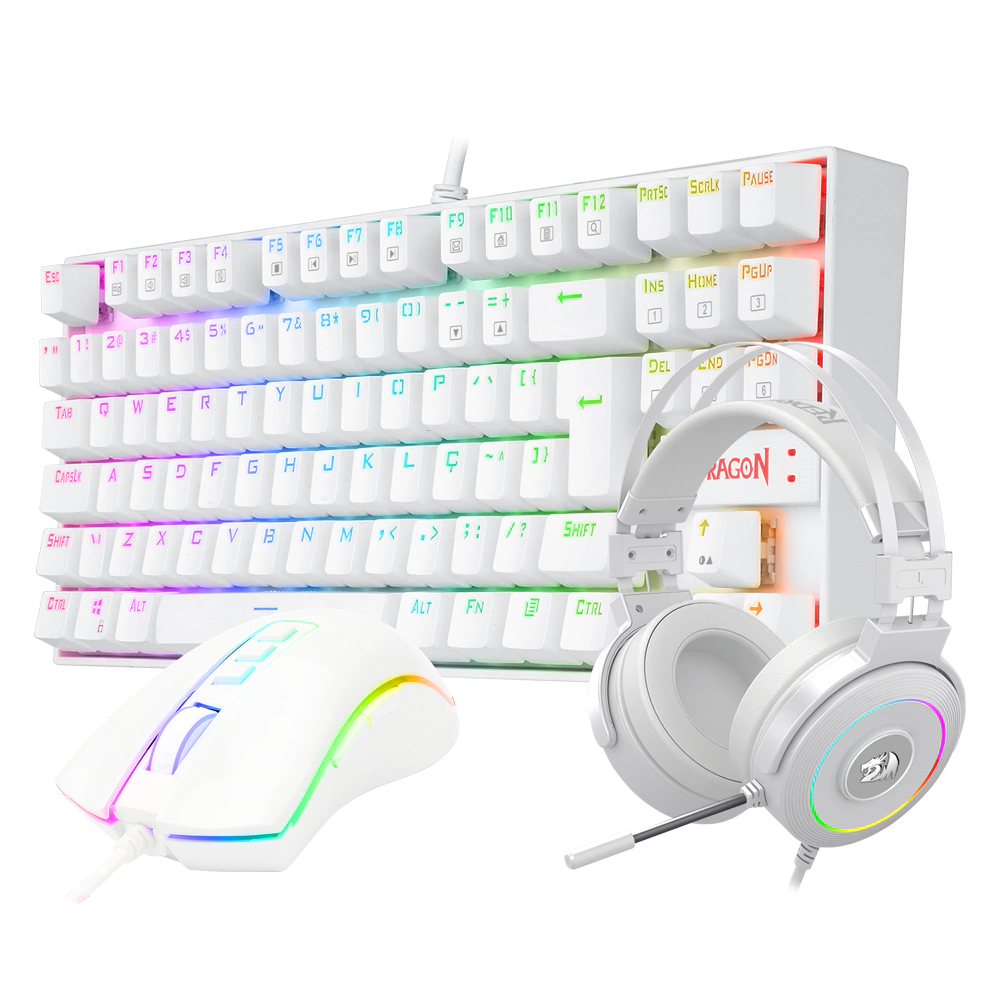 A Redragon apresenta o Kit S125 Lunar White, que traz os principais periféricos que um gamer precisa para tirar o máximo proveito de seus jogos. Ao contrário de outros kits gamers, o Redragon S125 oferece alguns dos produtos mais populares da marca, considerados de alta qualidade pela comunidade gamer. São eles o teclado Kumara RGB, o headset Lamia RGB e o mouse Cobra V2 RGB da linha Lunar White.